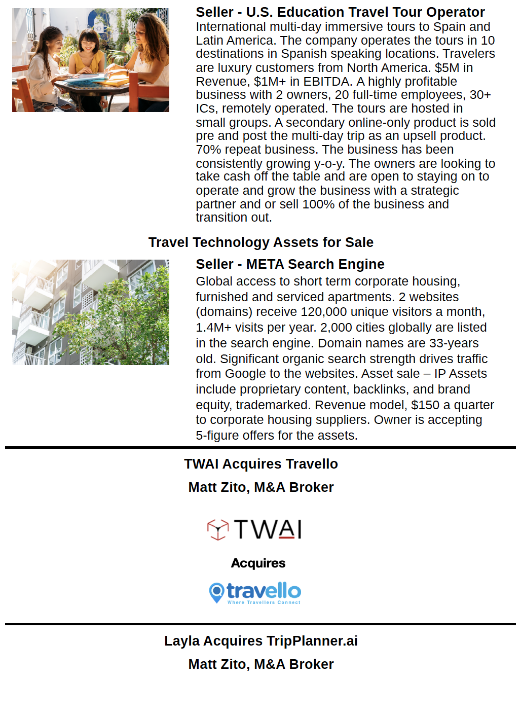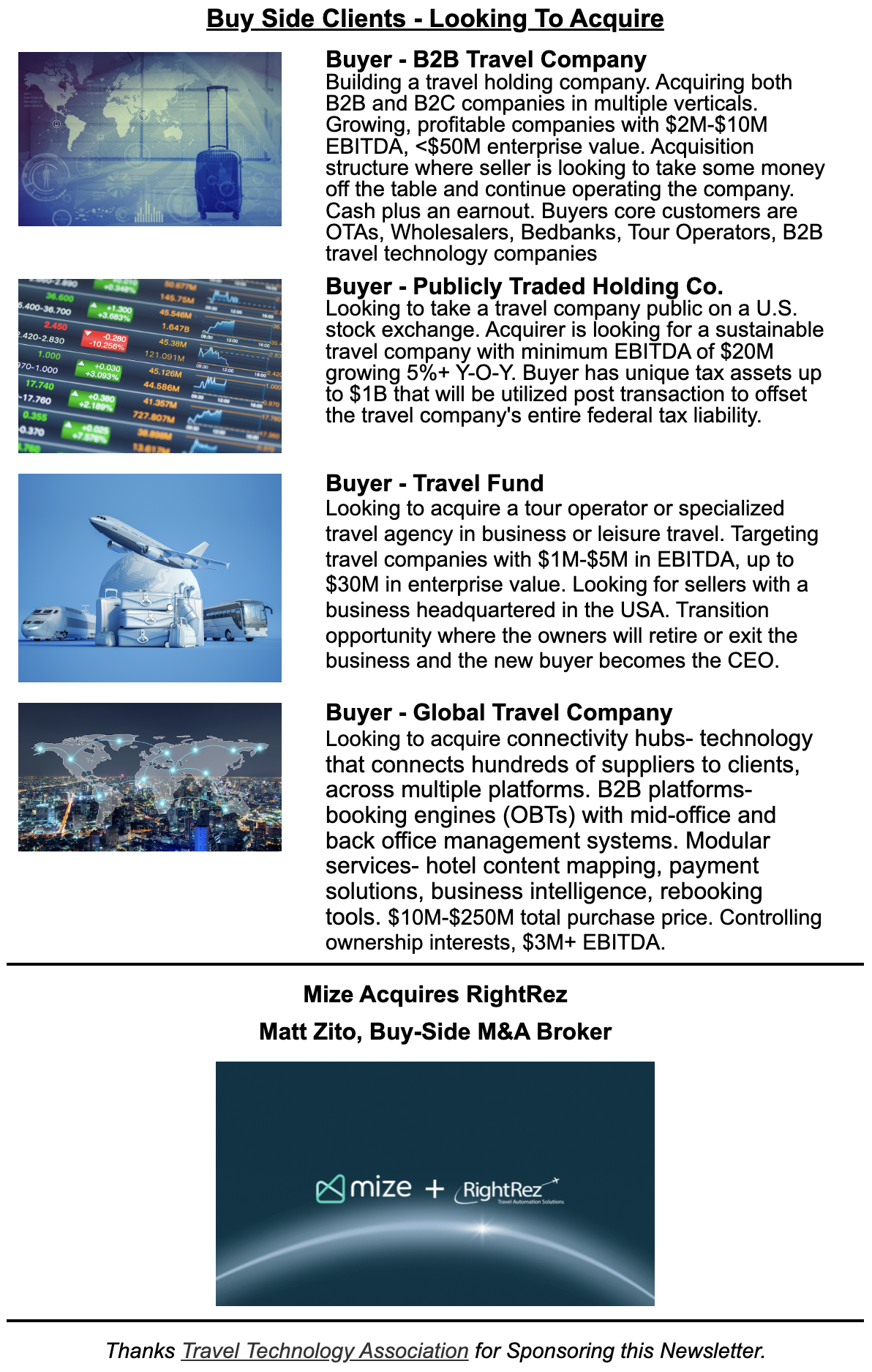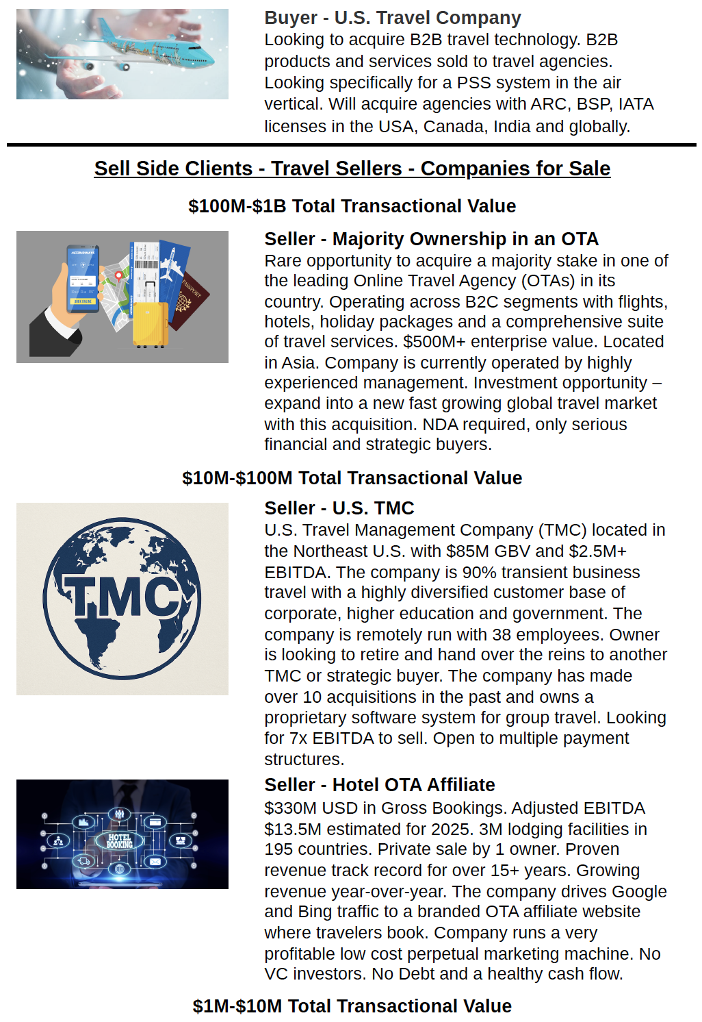 Receive our Travel M&A and Investment Newsletter. Sent out 1x-2x a month. Includes our deal flow, insights into the current M&A market and recent deals, offers, asks and valuations.