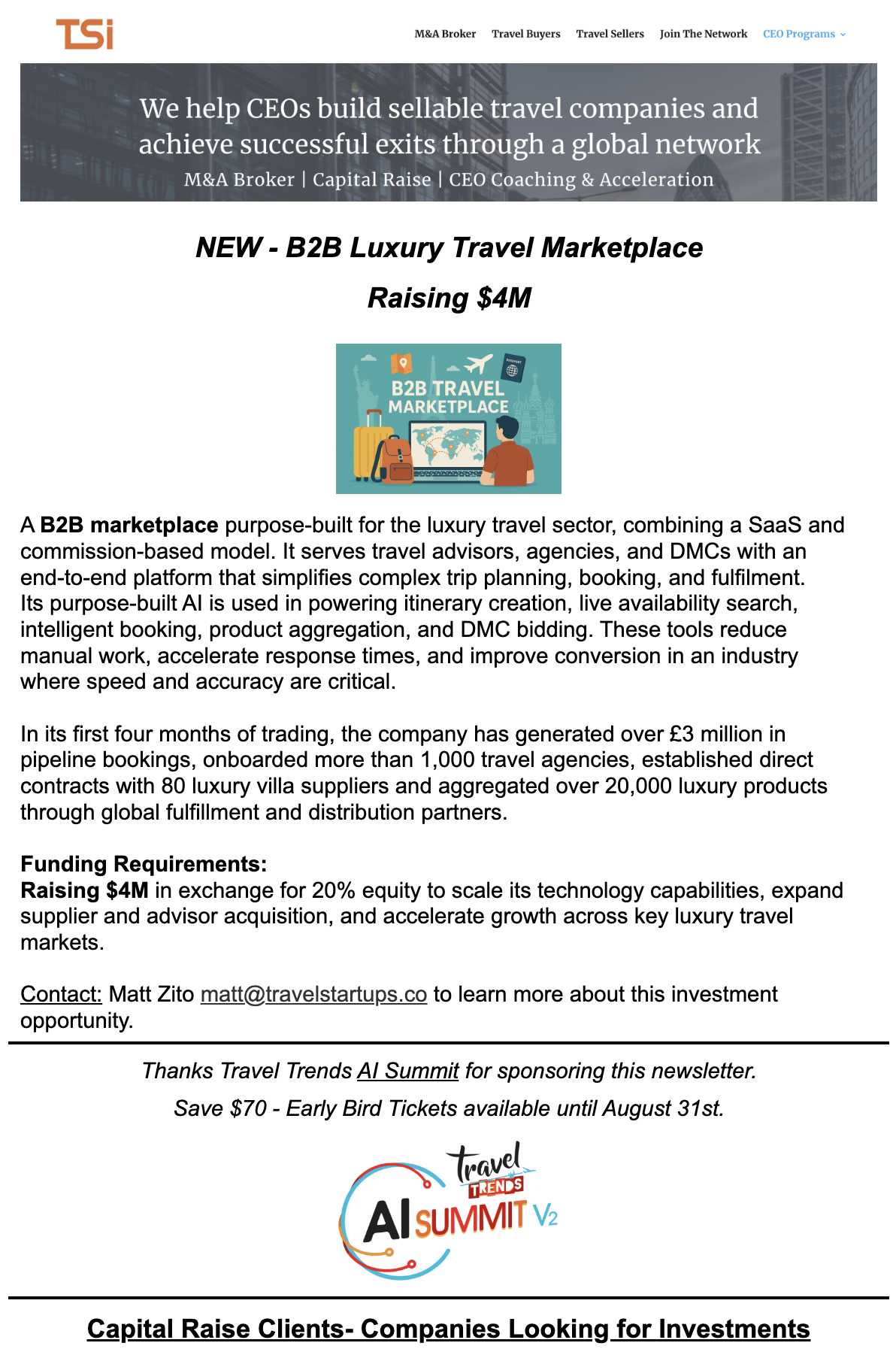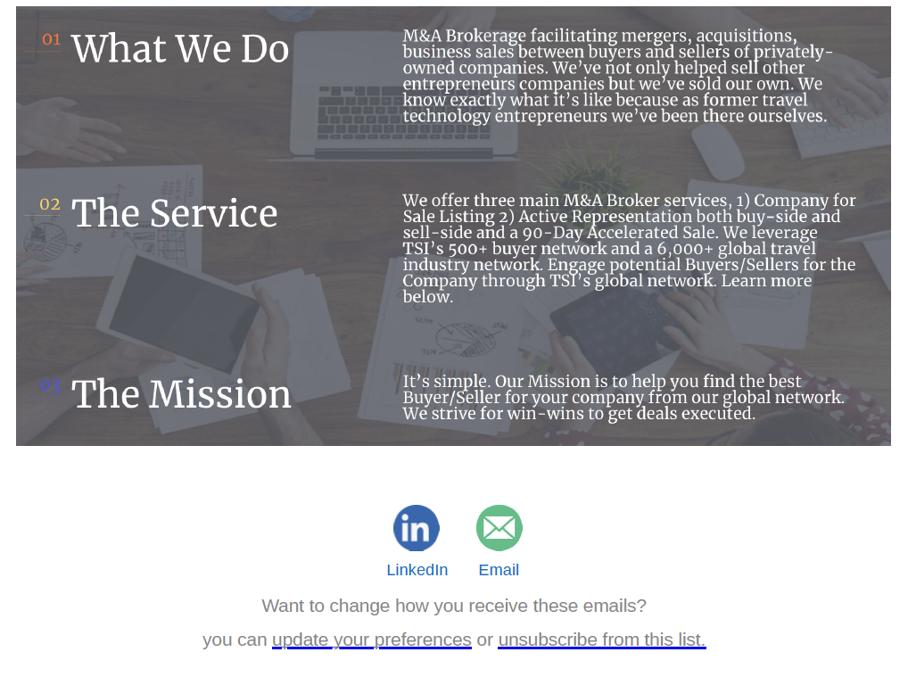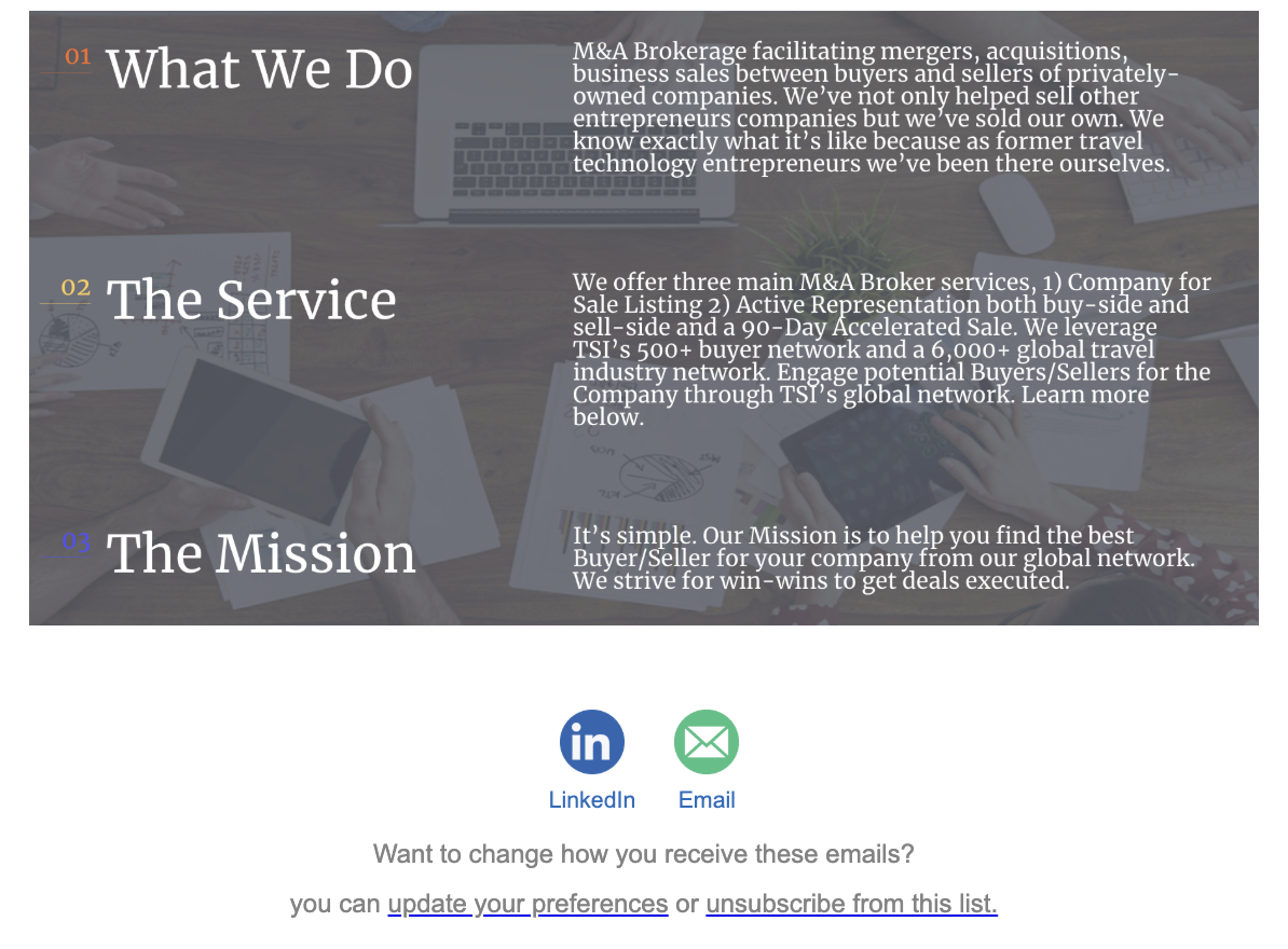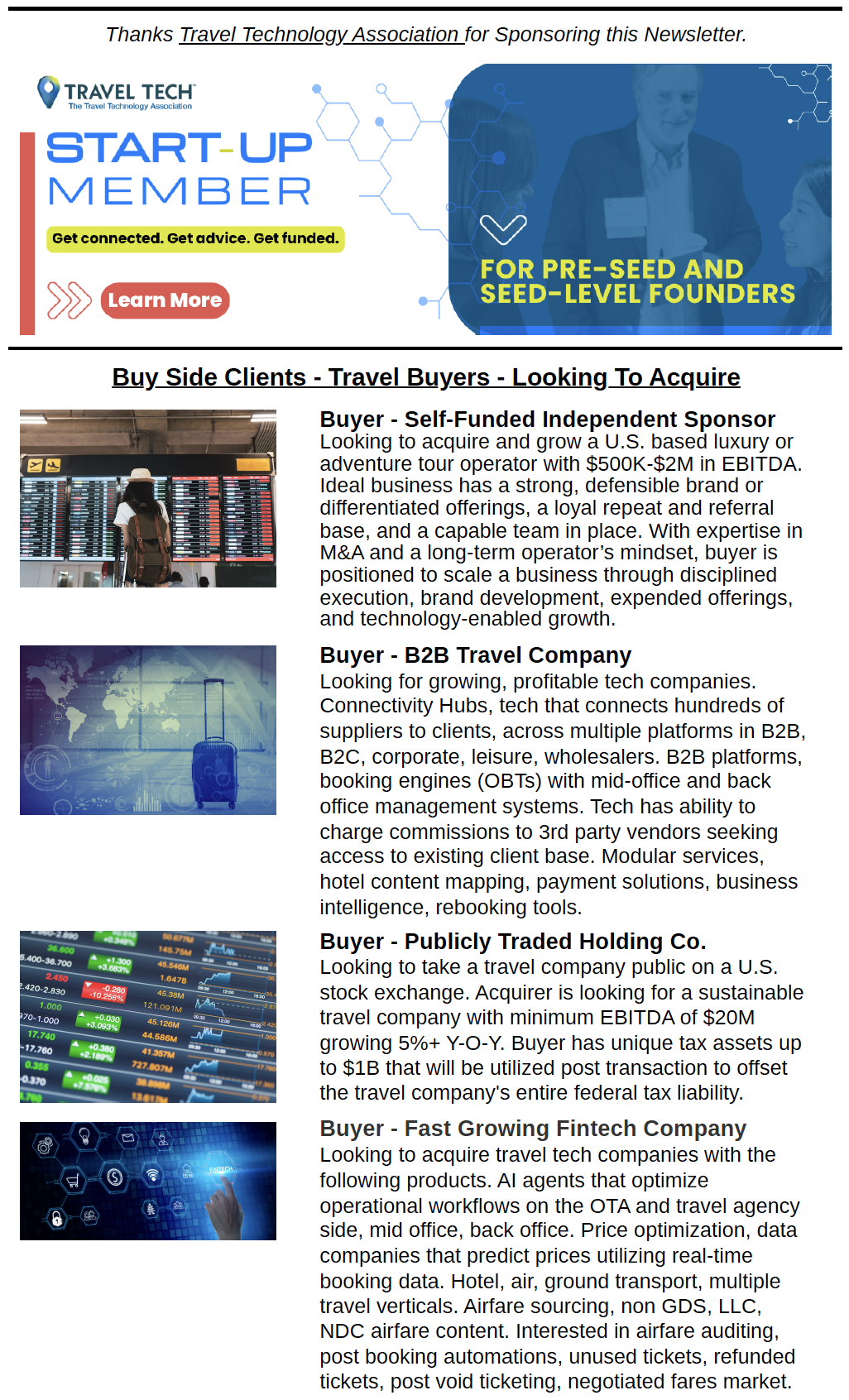 7,000+ of the leading global buyers and sellers of travel companies receive our M&A and Investment Newsletter each month. We actively promote our Buy-Side clients and Sell-Side clients through the newsletter.